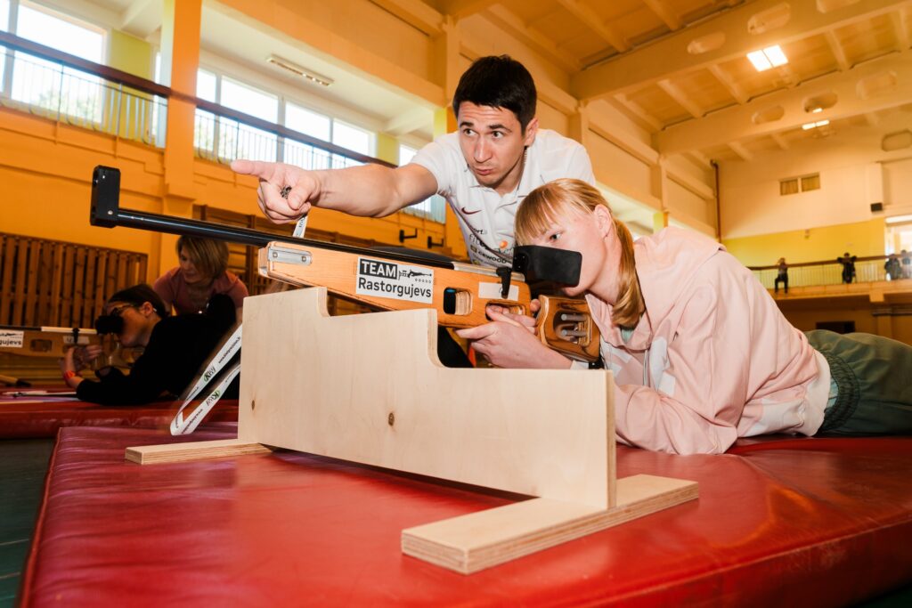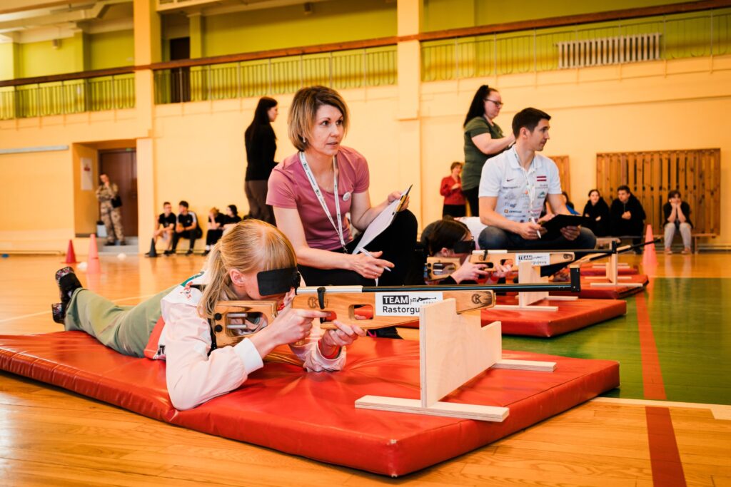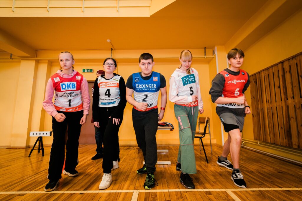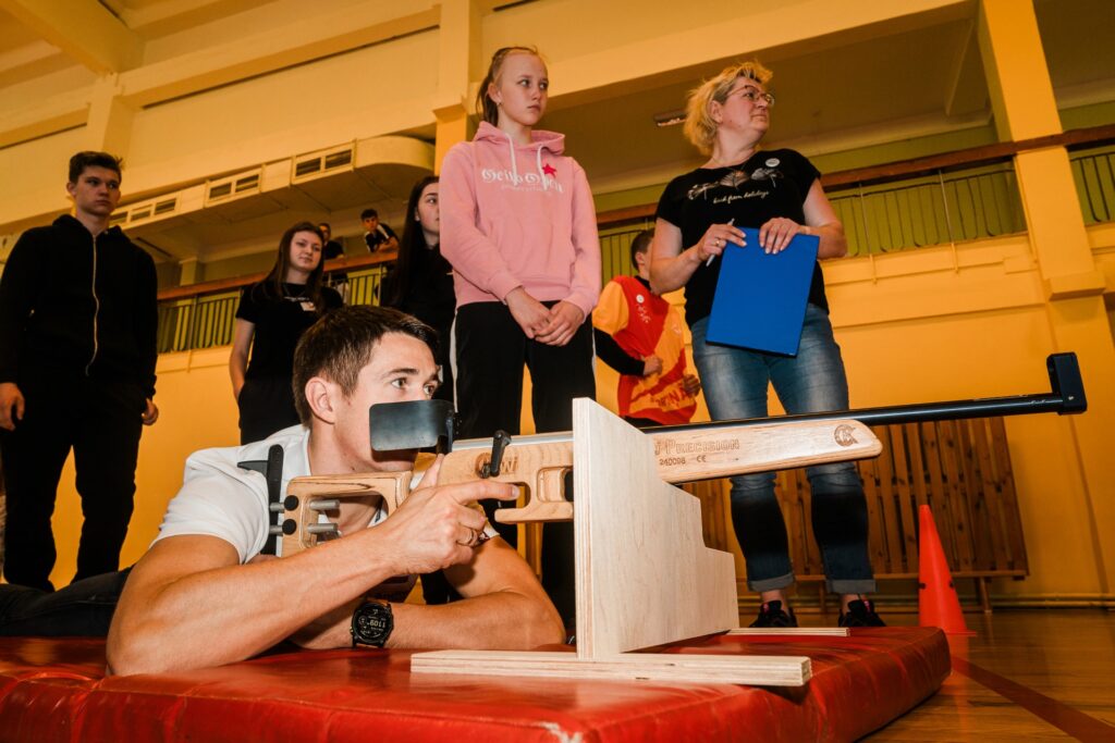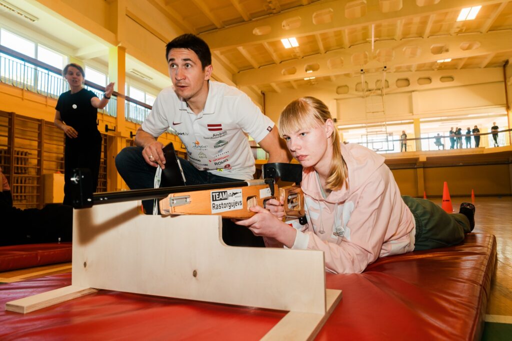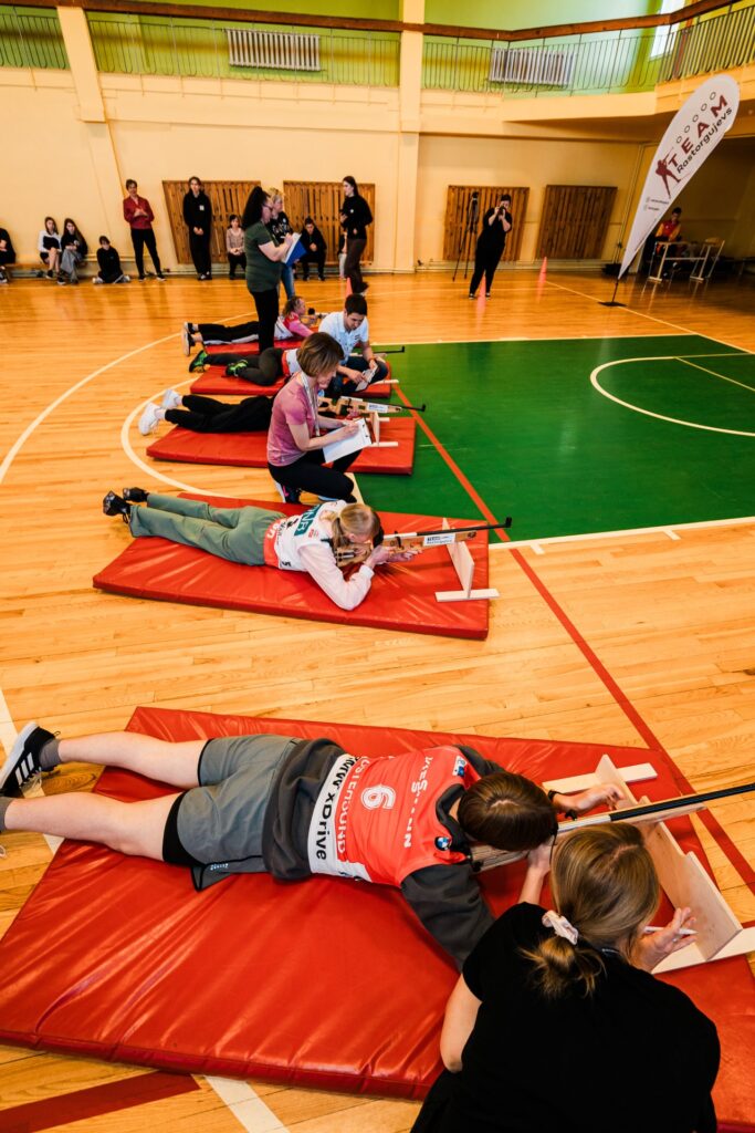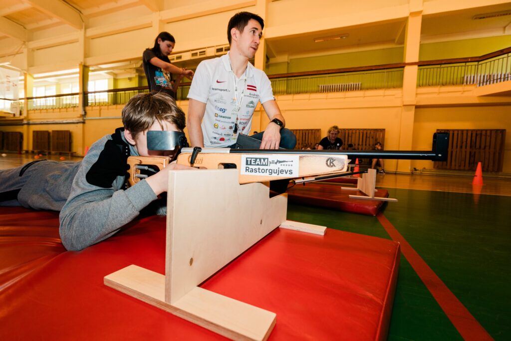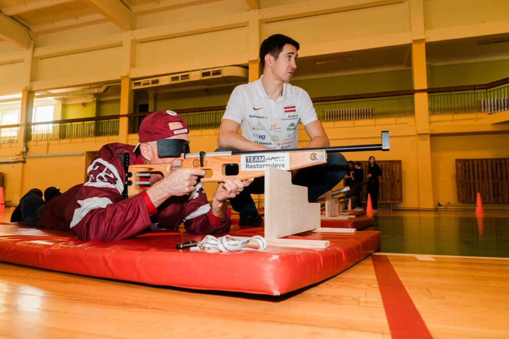 🎯 Olimpiskā karoga pacelšana un kopīga iesildīšanās, pēc kā sekoja biatlona sacensības, kur skolēniem bija jāapvieno ātrums un precizitāte, skrienot un šaujot pa mērķiem ar lāzerieroci.