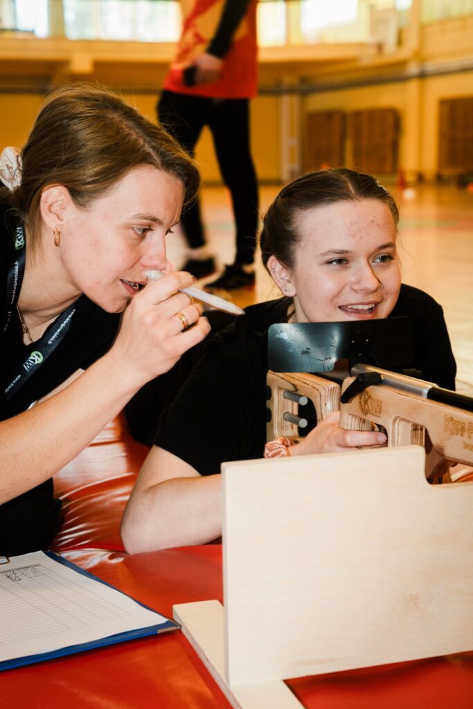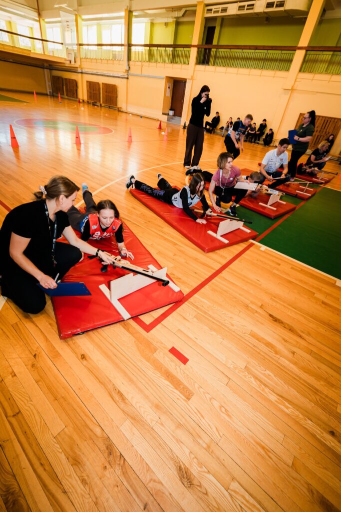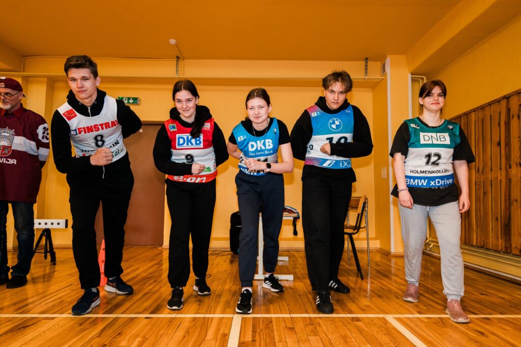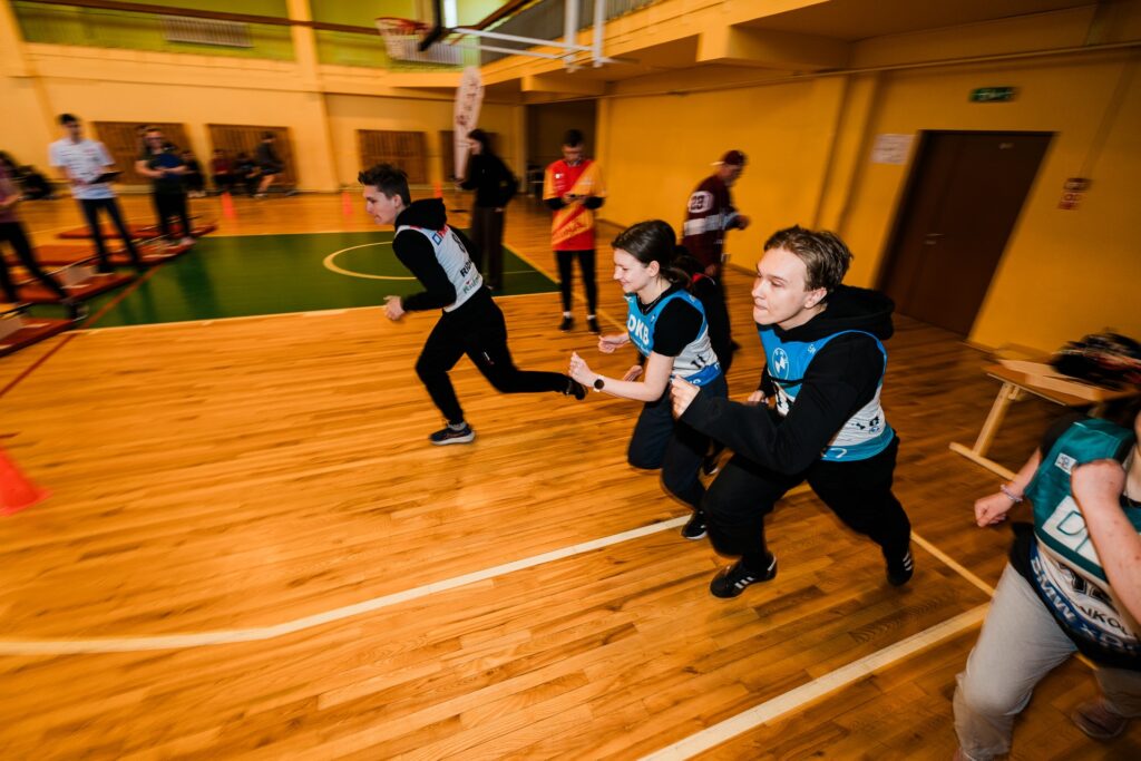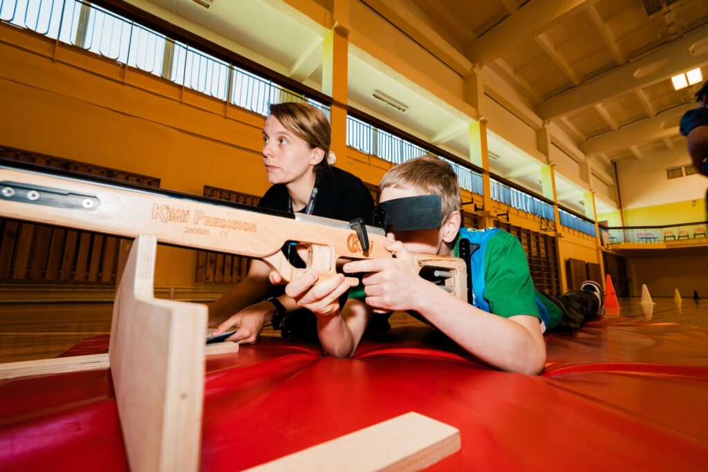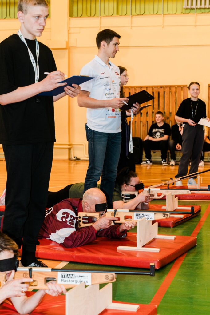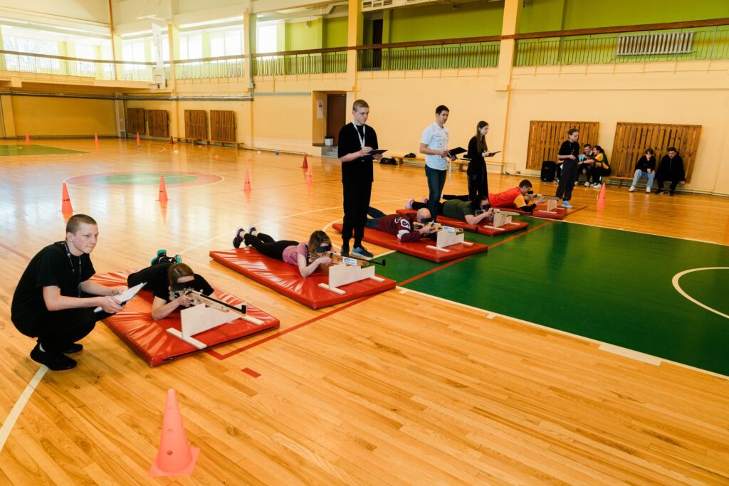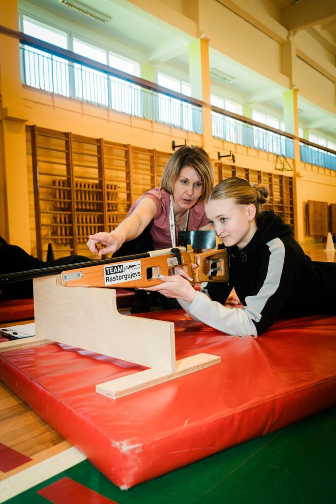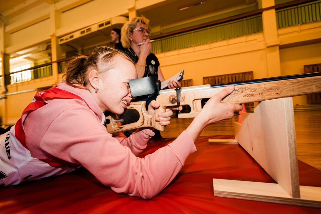 🎯 Olimpiskā karoga pacelšana un kopīga iesildīšanās, pēc kā sekoja biatlona sacensības, kur skolēniem bija jāapvieno ātrums un precizitāte, skrienot un šaujot pa mērķiem ar lāzerieroci.