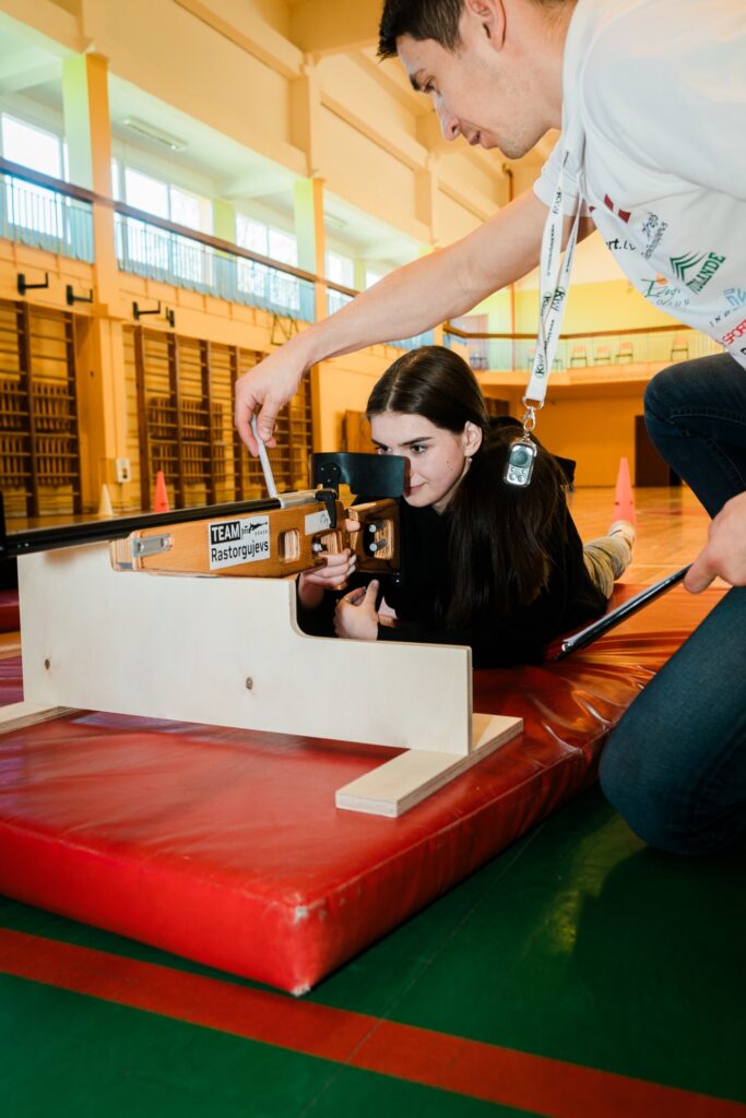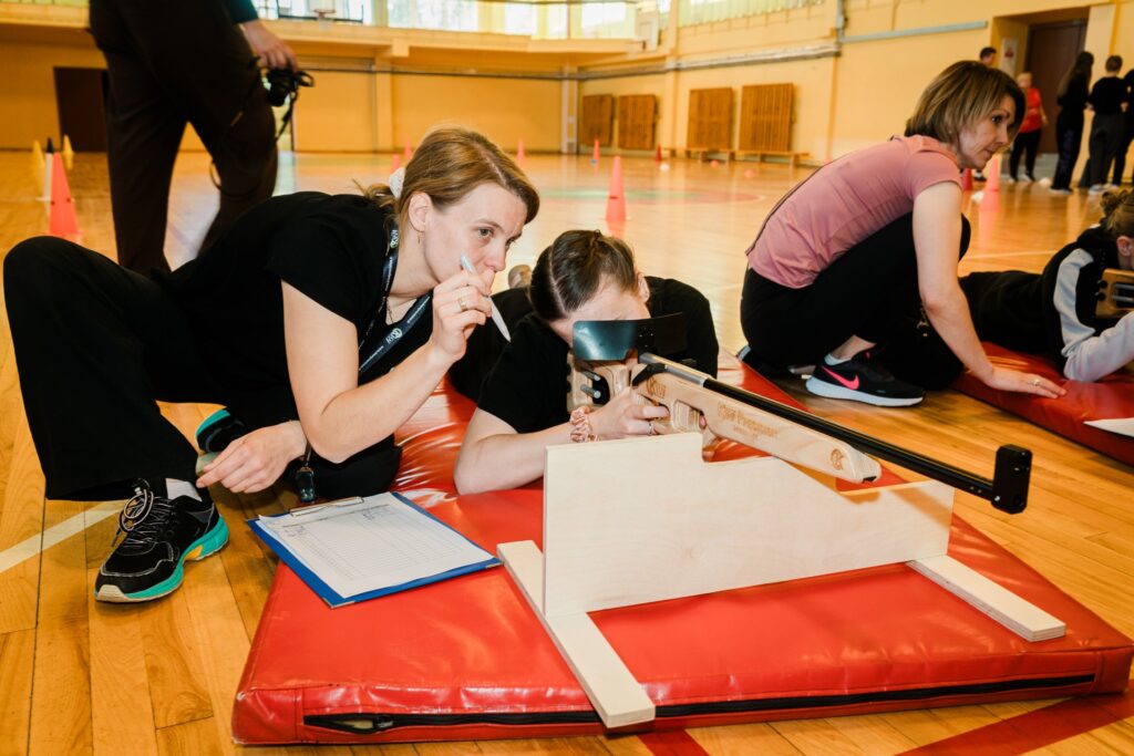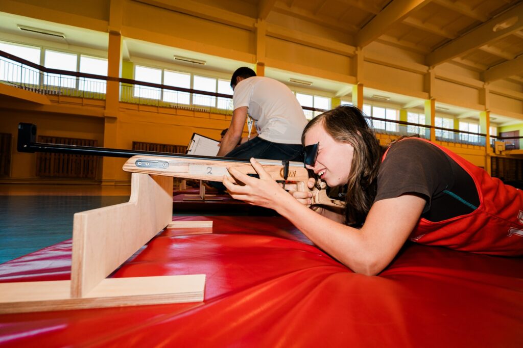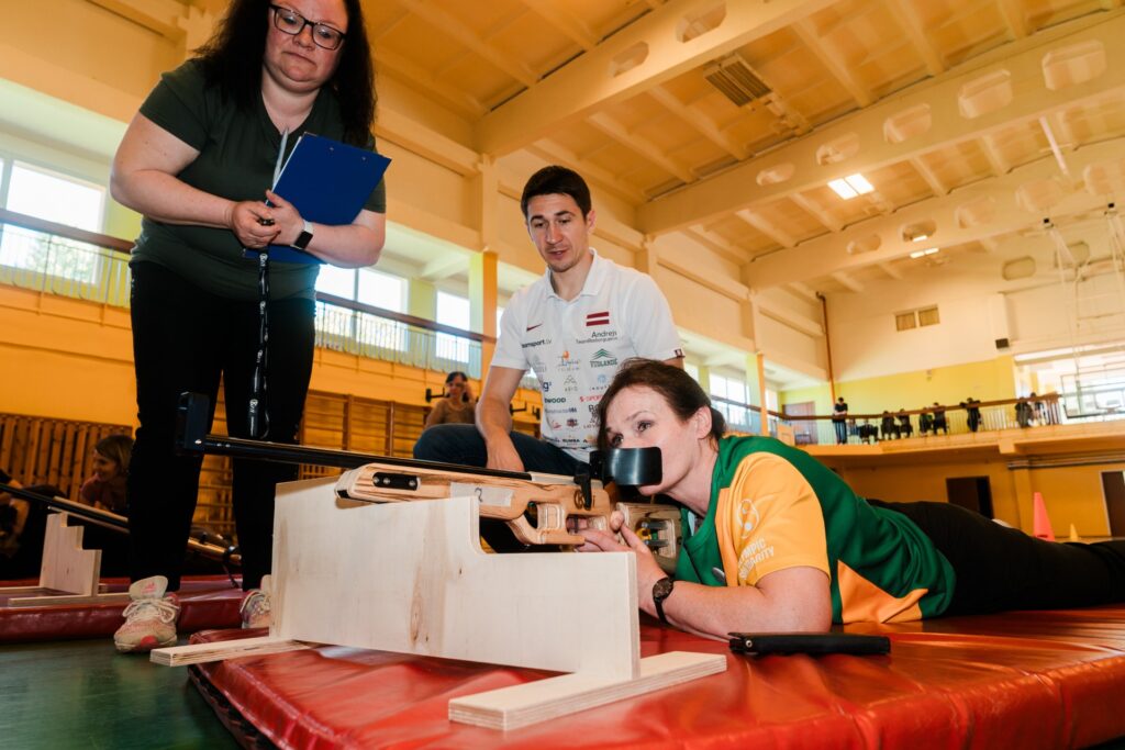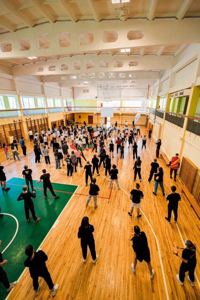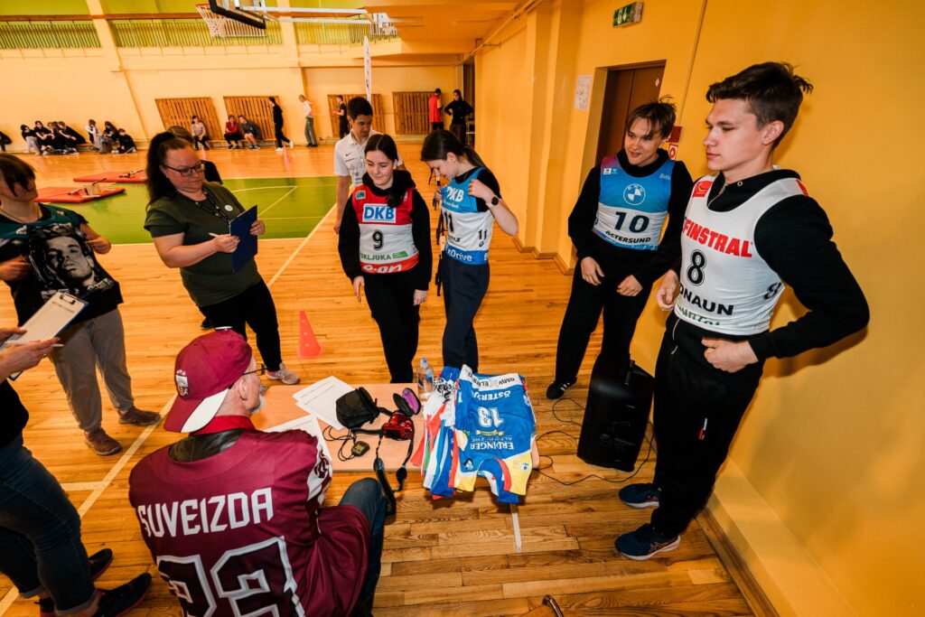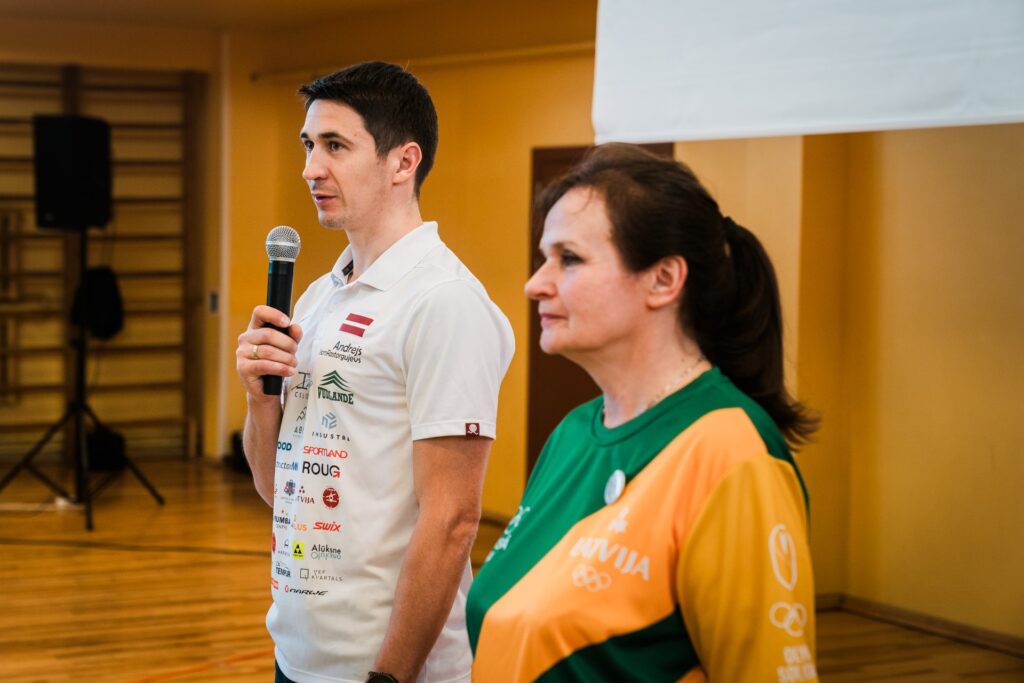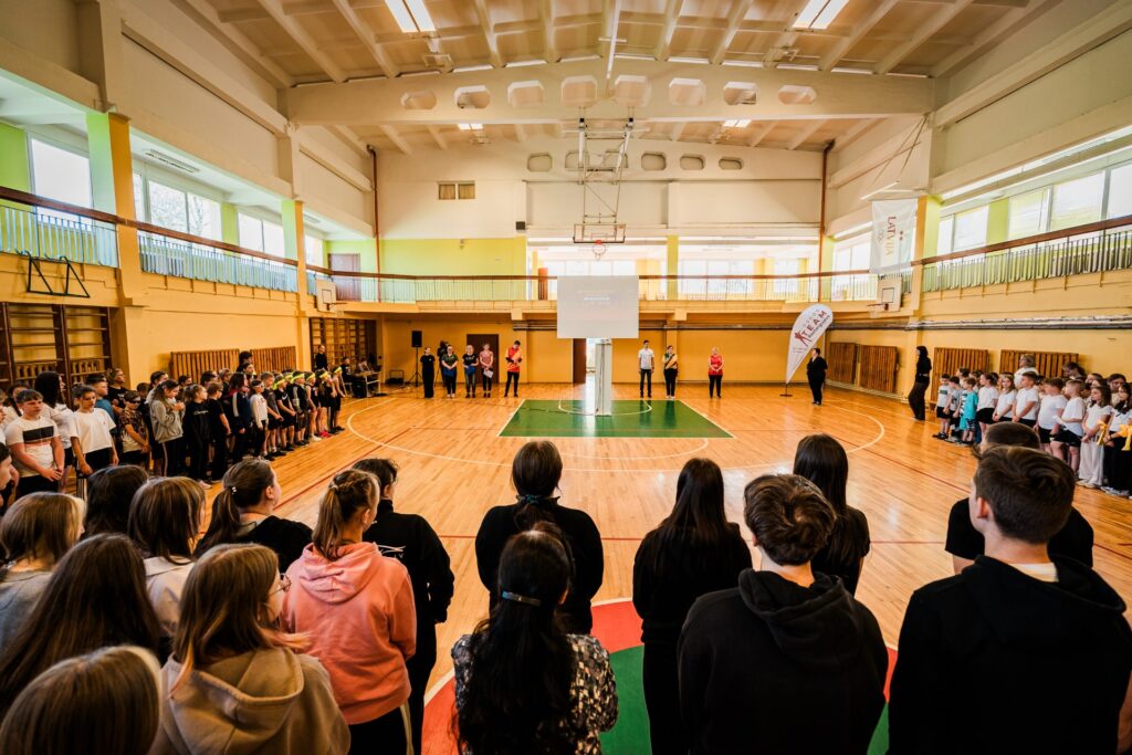 🎯 Olimpiskā karoga pacelšana un kopīga iesildīšanās, pēc kā sekoja biatlona sacensības, kur skolēniem bija jāapvieno ātrums un precizitāte, skrienot un šaujot pa mērķiem ar lāzerieroci.