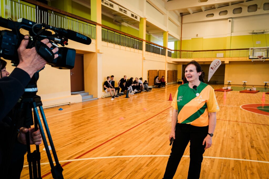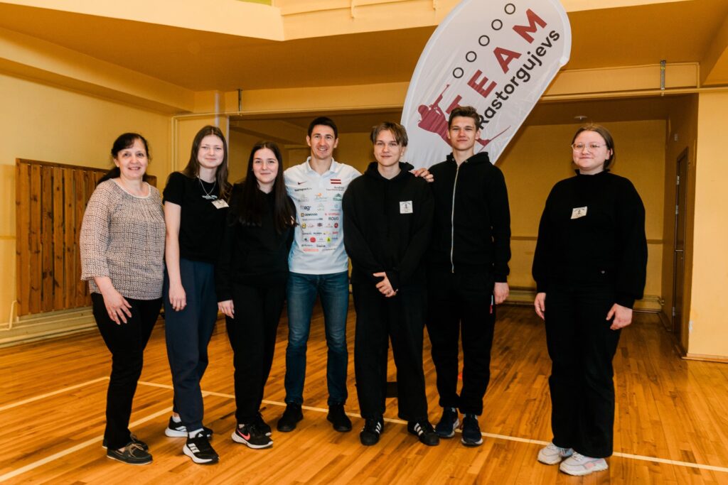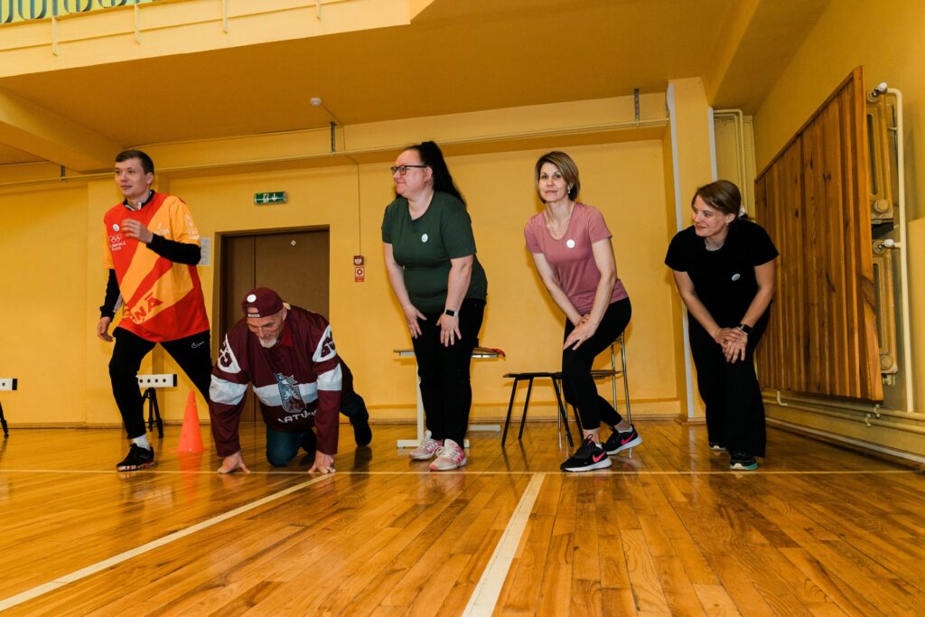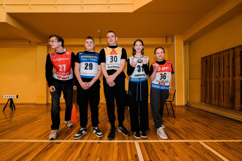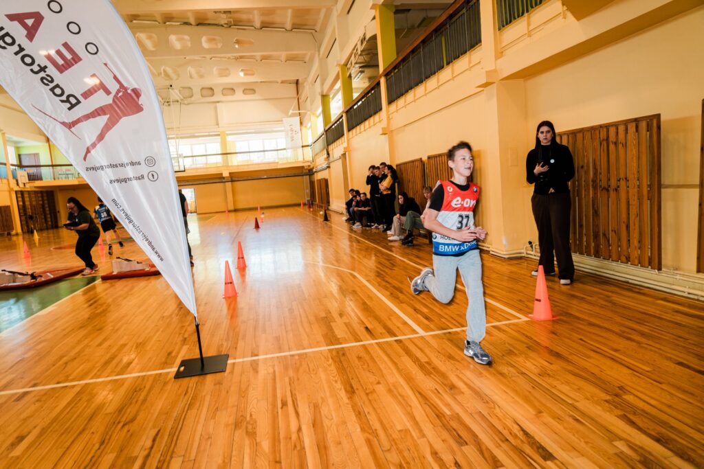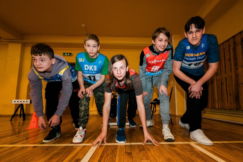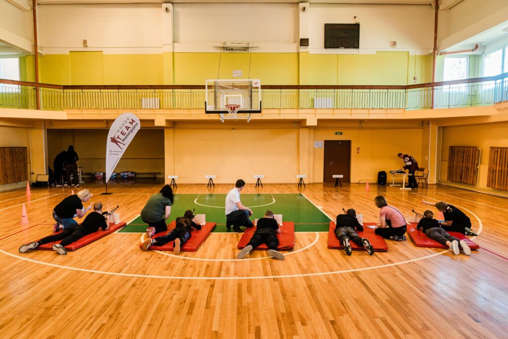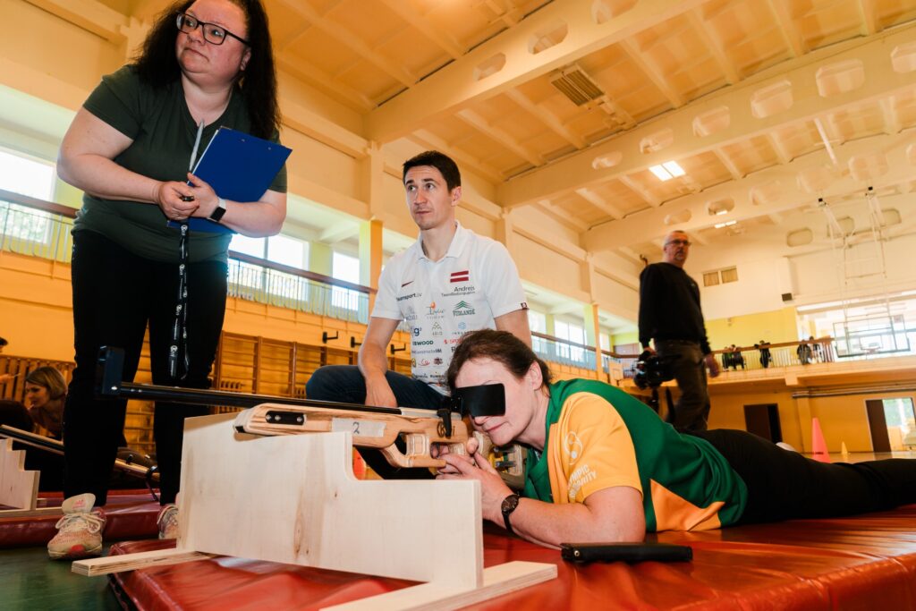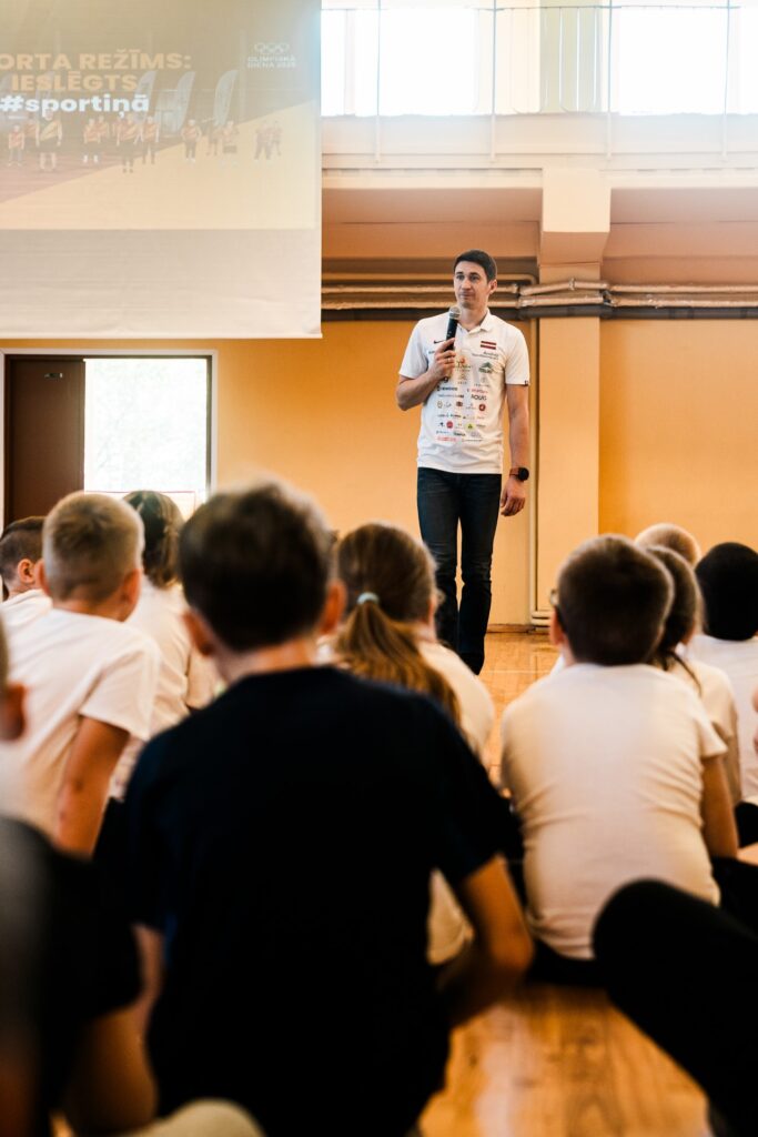 🎯 Olimpiskā karoga pacelšana un kopīga iesildīšanās, pēc kā sekoja biatlona sacensības, kur skolēniem bija jāapvieno ātrums un precizitāte, skrienot un šaujot pa mērķiem ar lāzerieroci.