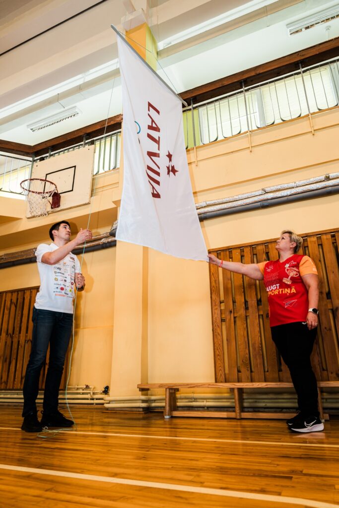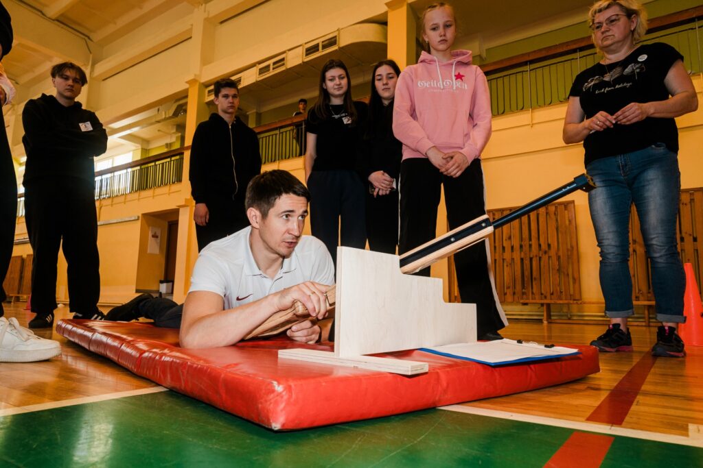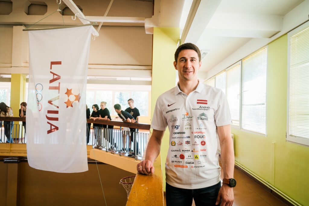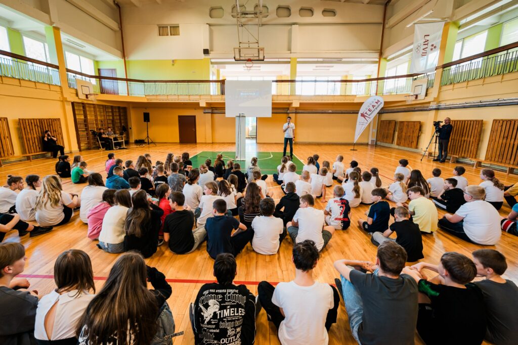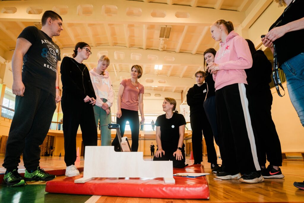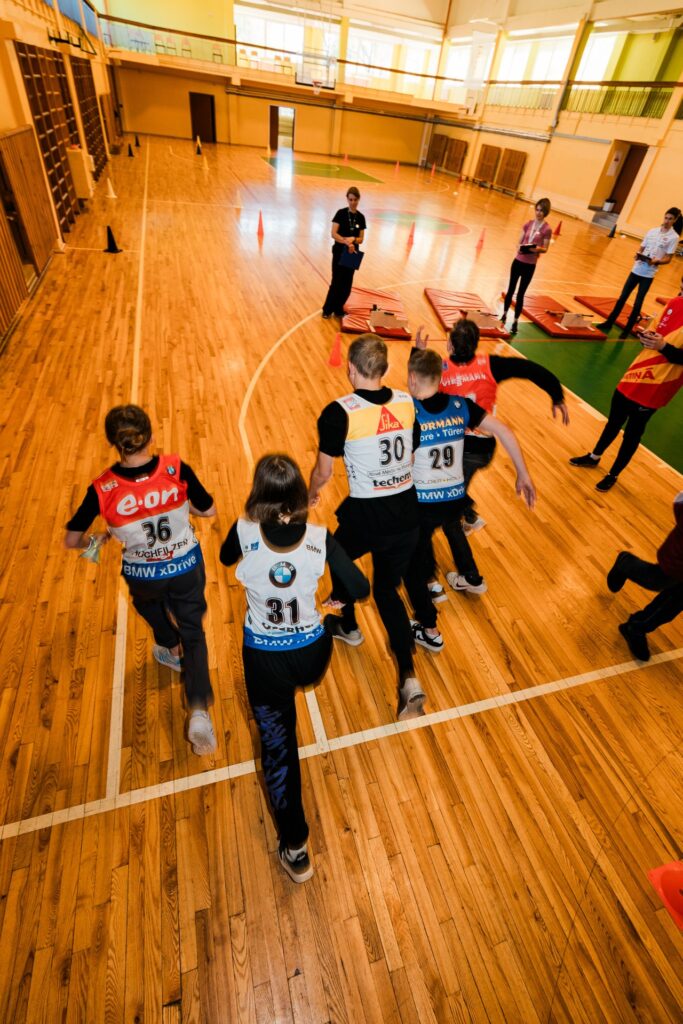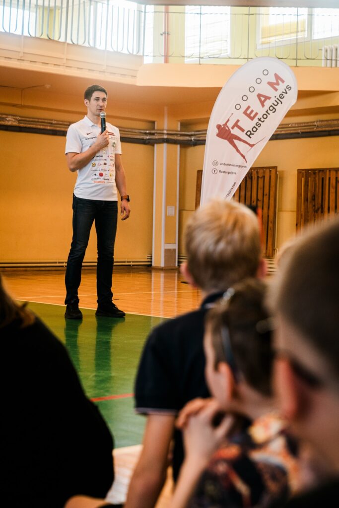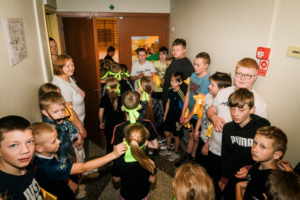 🎯 Olimpiskā karoga pacelšana un kopīga iesildīšanās, pēc kā sekoja biatlona sacensības, kur skolēniem bija jāapvieno ātrums un precizitāte, skrienot un šaujot pa mērķiem ar lāzerieroci.